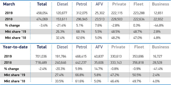 Mike Hawes, SMMT Chief Executive, said, “March is a key barometer for the new car market, so this fall is of clear concern. While manufacturers continue to invest in exciting models and cutting-edge tech, for the UK to reap the full benefits of these advances, we need a strong market that encourages the adoption of new technology. That means supportive policies, not least on vehicle taxation and incentives, to give buyers the confidence to invest in the new car that best meets their driving needs. Above all, we urgently need an end to the political and economic uncertainty by removing permanently the threat of a ‘no deal’ Brexit and agreeing a future relationship that avoids any additional friction that would increase costs and hence prices.”