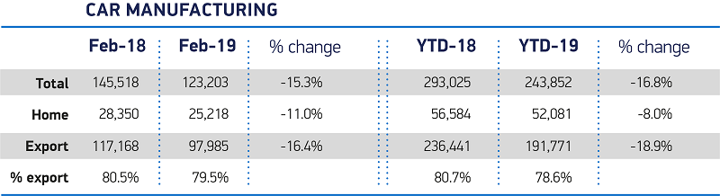 UK car production fell by -15.3% in February, with 123,203 units manufactured, according to figures released today by the Society of Motor Manufacturers and Traders (SMMT). Declining demand in the UK and in key European and Asian export markets resulted in output falling for the ninth consecutive month.