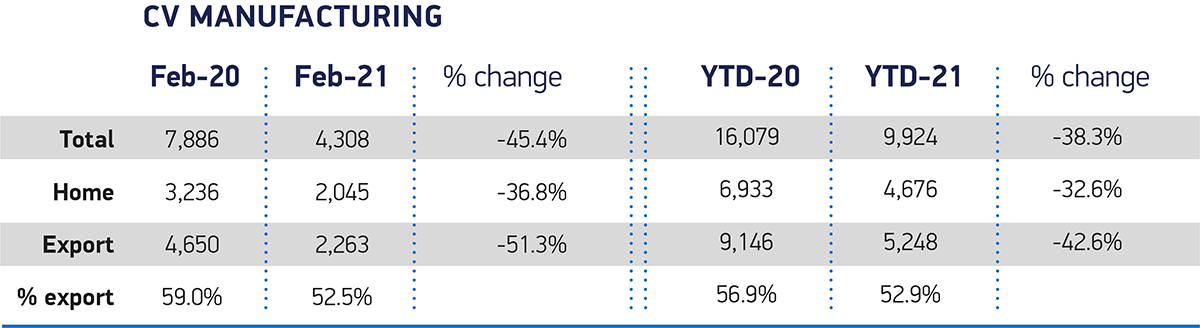UK commercial vehicle (CV) production declined -45.4% in February, with 4,308 units built, according to the latest figures released today by the Society of Motor Manufacturers and Traders (SMMT). CV manufacturing entered its fifth consecutive month of decline as supply chain shortages, new customs processes and prolonged lockdown measures across the globe affected output, resulting in the worst February on record.1